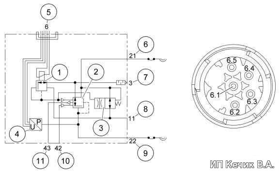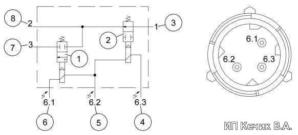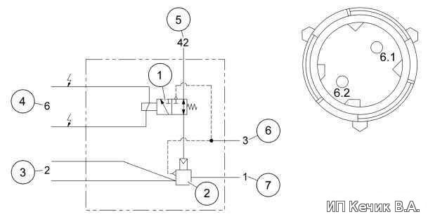 Клапан управления тормозами прицепа установлен в тормозной системе с электрическим регулированием в качестве исполнительного элемента для регулировки давления в соединительной головке. Основной функцией модуля управления тормозами прицепа является регулировка тормозного давления в управляющем трубопроводе прицепа (разъем 22) и сравнение тормозных усилий (система регулирования силы сцепки) между тянущим и буксируемым транспортным средством. Стояночная тормозная система (разъем 43) и функция разрыва работают обычным образом. Клапан управления тормозами прицепа включает в себя электромагнитный клапан пропорционального регулирования, релейный клапан для предотвращения разрыва соединения и датчик давления. Электрическое управление и контроль выполняются с помощью центрального тормозного устройства. Ток управления, заданный электрической схемой, посредством электромагнитного клапана пропорционального регулирования преобразуется в управляющее давление для релейного клапана. Выходное давление клапана управления тормозами прицепа пропорционально этому давлению. Пневматическое управление релейным клапаном выполняется при помощи резервного давления центрального тормозного устройства и давления на выходе клапана ручного тормоза. Резервный клапан Рис 6