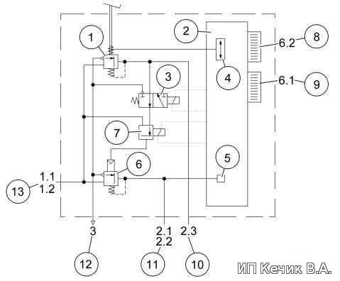 Резервный клапан представляет собой комбинацию 3/2-ходового электромагнитного клапана с релейным клапаном для снижения регулируемого резервного давления на заднем мосту для автомобилей с высоким соотношением при загрузке и без нее на заднем мосту. Он предотвращает в неотложном случае избыточное торможение заднего моста. Не оказывающее влияния выходное давление тормозного клапана в центральном тормозном устройстве является резервным регулирующим давлением для резервного клапана на заднем мосту. Этот комбинированный 3/2-ходовой электромагнитный релейный клапан уменьшает давление регулирования в соотношении 1:2. Пониженное давление регулирования действует в модуле регулировки давления заднего моста через специальный перепускной клапан непосредственно на поршни релейных клапанов двух контуров регулировки давления. При исправной EBS в начале каждого торможения резервное давление отключается посредством 3/2-ходового электромагнитного клапана в резервном клапане. При неисправности EBS или полном отказе подачи электропитания в электронной цепи всегда, следовательно, действует указанный резерв. Клапан регулирования давленияРис 7