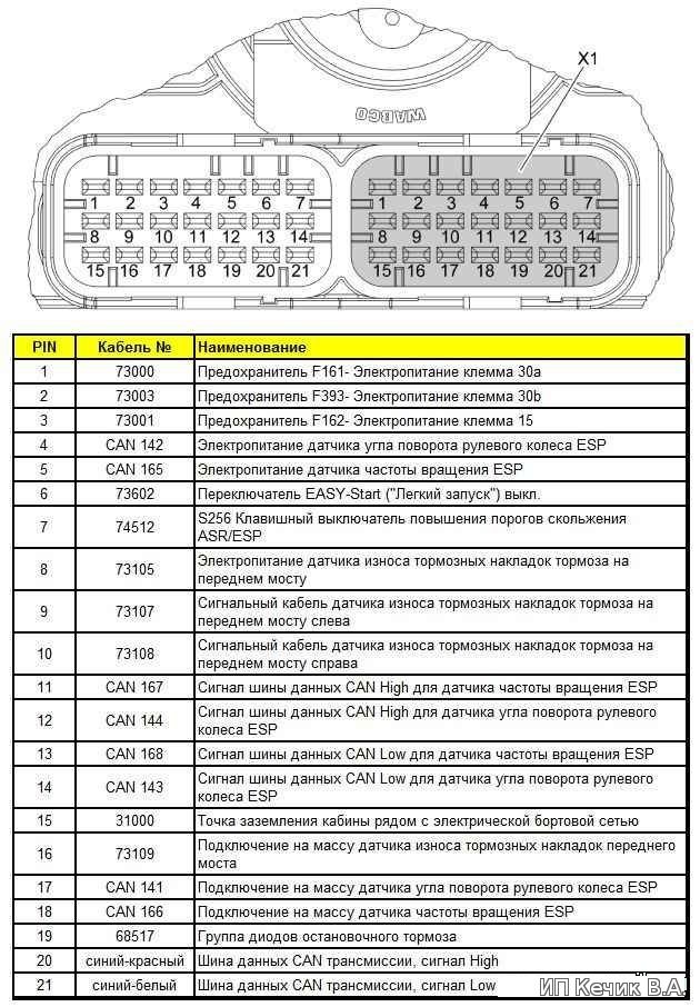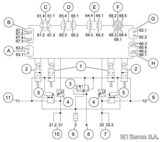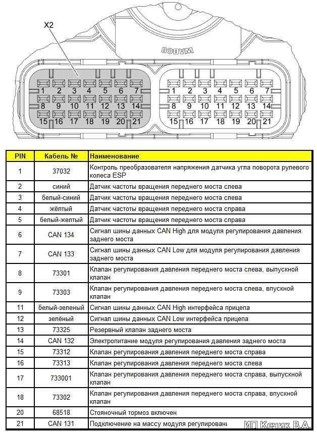 Пневматическое устройство является одноконтурным. Контур переднего моста снабжает тормозной клапан, клапан пропорционального регулирования и релейный клапан. Удержание тормозного клапана можно в конце хода педали нарушить при регулировании давления ресивера в полном объеме. Резервное давление тормозного вентиля направляется непосредственно через разъем 2.3 к клапану управления тормозами прицепа и через дополнительный резервный клапан, отделенный от контура, к модулю регулирования давления заднего моста. С помощью интегрированного 3/2-ходового электромагнитного клапана можно регулировать резервное давление переднего моста. Если регулируется интегрированный 3/2-ходовой электромагнитный клапан, то он удерживает резервное давление. Клапан пропорционального регулирования регулирует пропорционально току давление, которое действует на камеру управления релейного клапана. Тормозное давление в разъемах 2.1/2.2 измеряется датчиком давления. Требуемое тормозное давление регулируется контуром регулировки давления центрального тормозного устройства. Релейный клапан содержит два разъема для тормозных цилиндров переднего моста. Резервное давление подается через два разъема центрального тормозного устройства. Регулировка ABS переднего моста выполняется в конструкциях 4S/4M с помощью внешних регулировочных клапанов ABS, которые управляются центральным тормозным устройством. Они расположены между центральным тормозным устройством и тормозными цилиндрами. В конструкциях 4S/3M регулировка ABS выполняется в соответствии с мостом с помощью релейного клапана пропорционального регулирования в центральном тормозном устройстве. Разводка контактов блока управления EBSШтекер Х1Рис 2 Штекер Х2Рис 3 Модуль регулирования давления (2-канальный)Рис 4